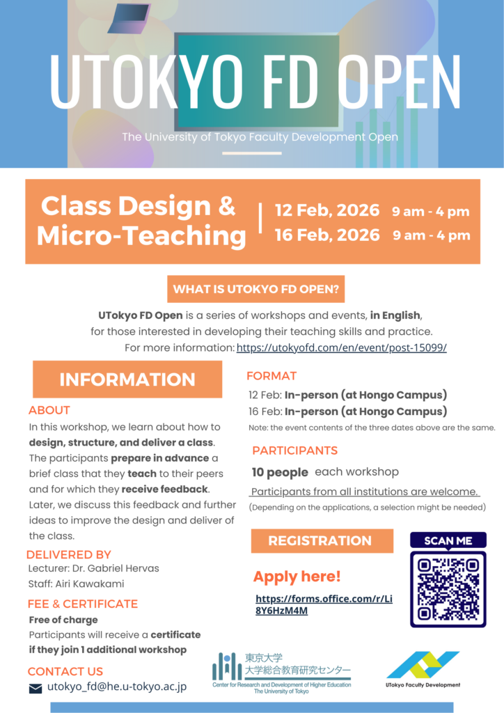(Those who would like to receive a certificate must simultaneously register for either the “Class Design & Microteaching” session or any two other sessions from the UTokyo FD Open series.)